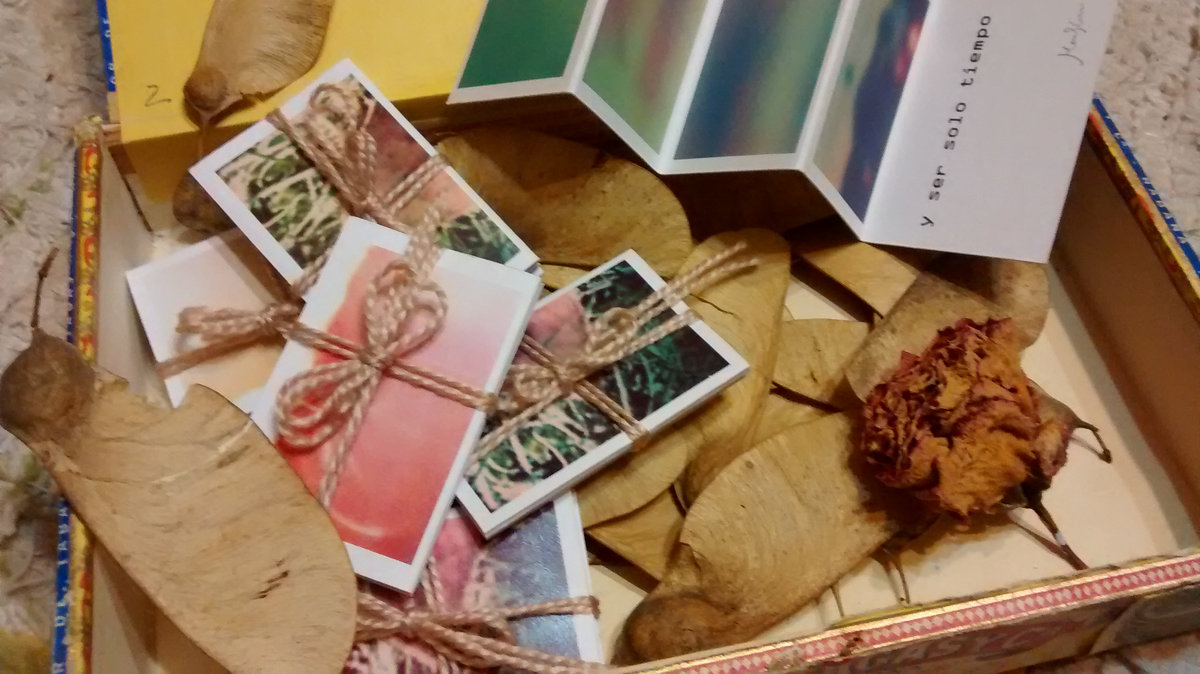 Little matte paper pictures printed on 20x5cm with 'visual instructions to be'. E.g. a leave's shiver or just time.